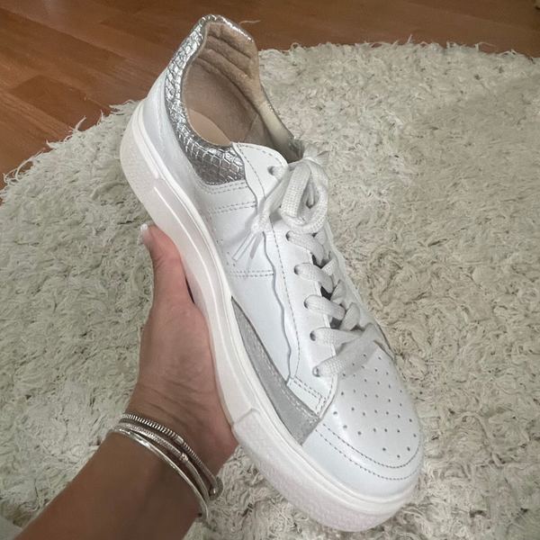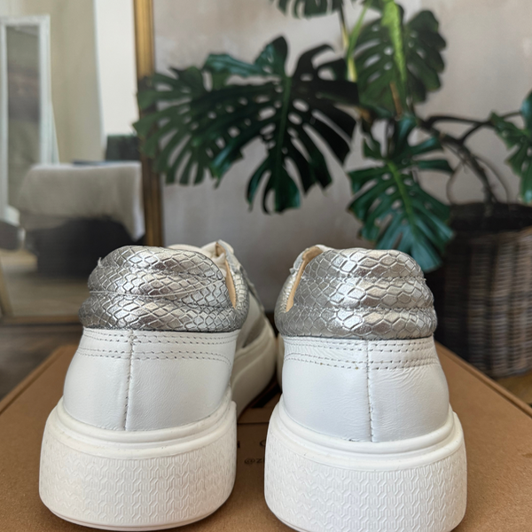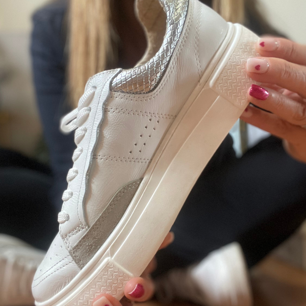 Zapatillas de cuero con detalle de gamuza y cuero craquelado en plata en la parte trasera .